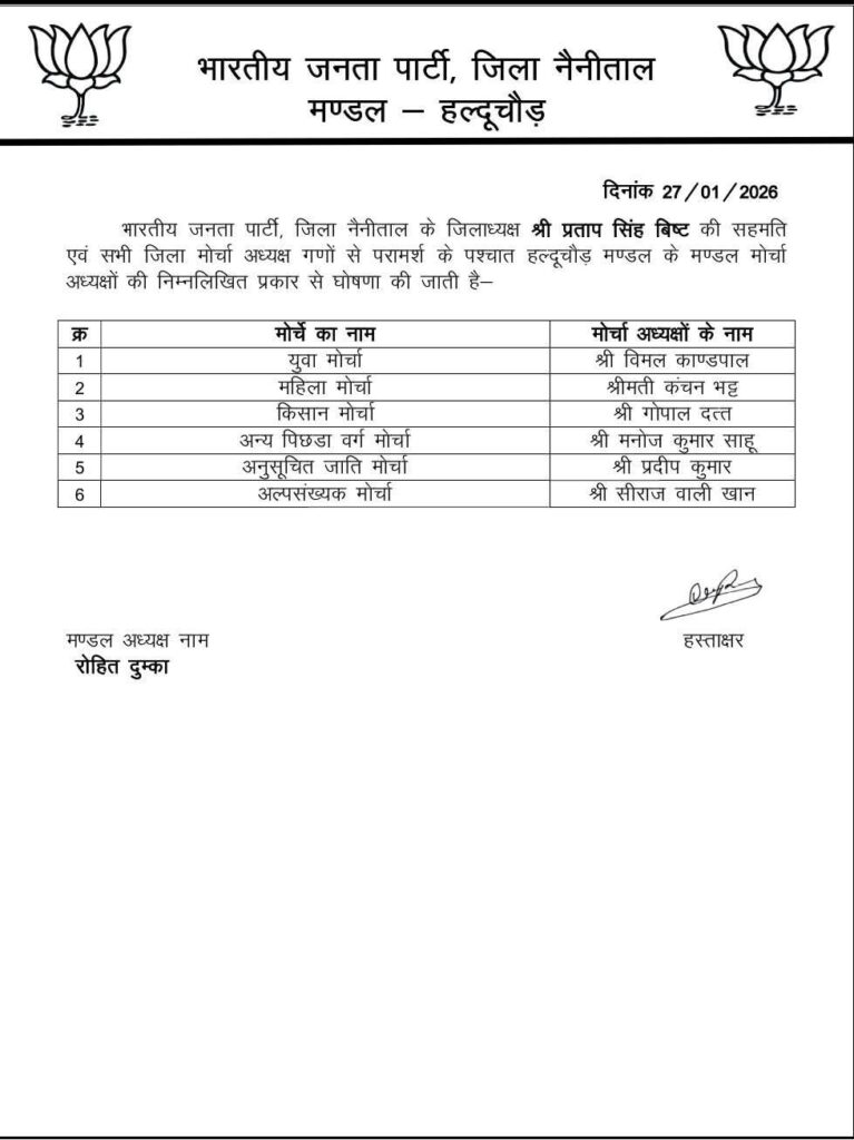भारतीय जनता पार्टी हल्लुचौड़ मंडल के तेज-तर्रार एवं ऊर्जावान मंडल अध्यक्ष श्री विजय रोहित दुमका द्वारा संगठनात्मक मजबूती की दिशा में एक महत्वपूर्ण कदम उठाते हुए मंडल के अंतर्गत आने वाले सभी मोर्चों के नव-नियुक्त मंडल अध्यक्षों की सूची जारी की गई।